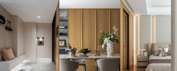 落地花盆和绿植给空间增添了不少生机。餐厅选了白色大理石桌搭配灰色皮椅,与原木地板完美呼应。卧室和更衣间延续极简风,线条简洁,灯光柔和,低调却奢华。