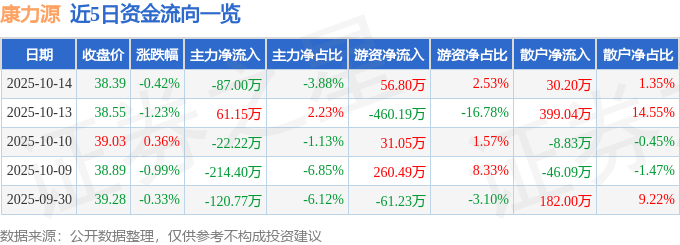 股票行情快报:康力源(301287)10月14日主力资金净卖出8700万元